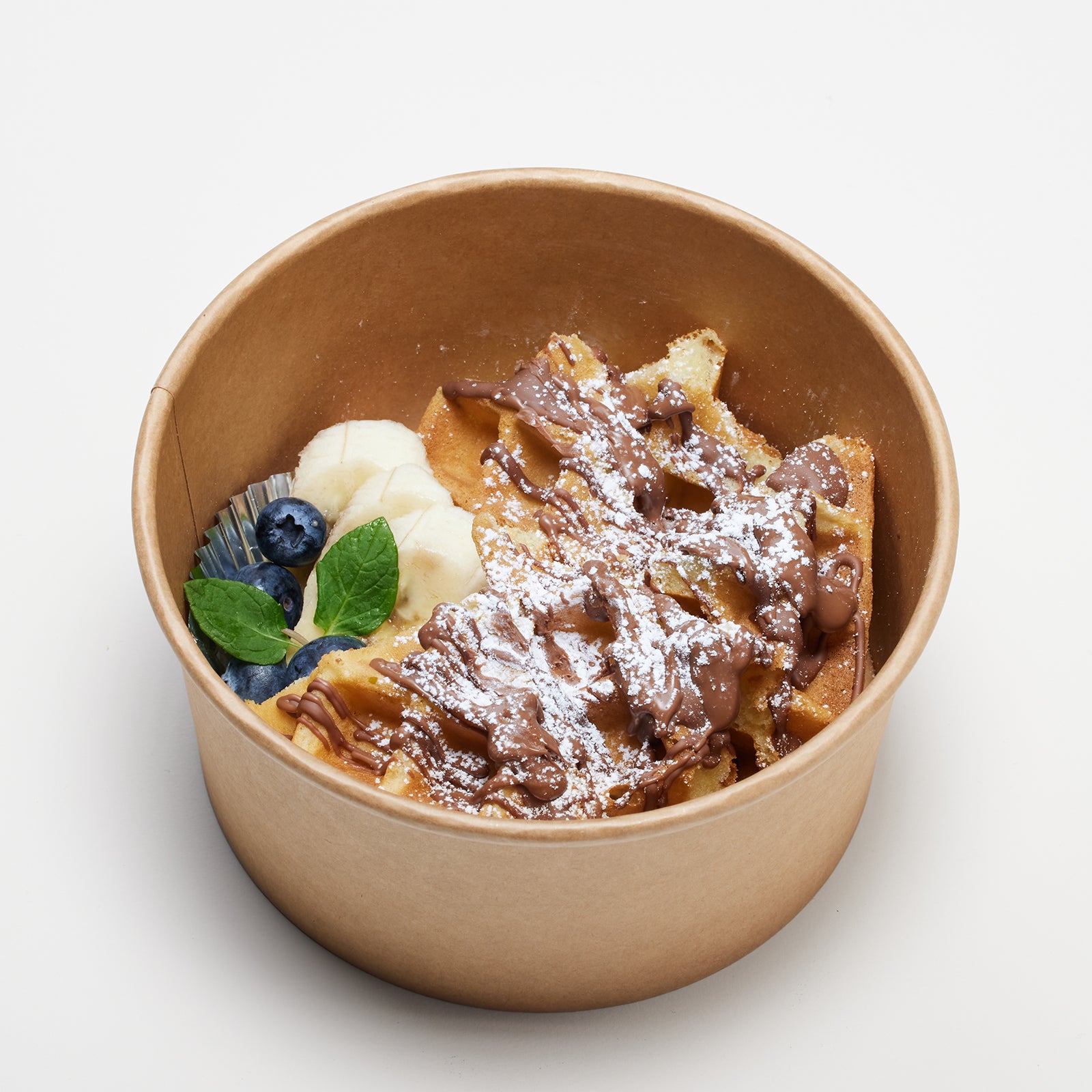 外はサクサク中はモチモチで軽くて食べやすいワッフル。冷めても美味しくお召し上がりいただけます。チョコソースには高級ベルギーチョコを使用。