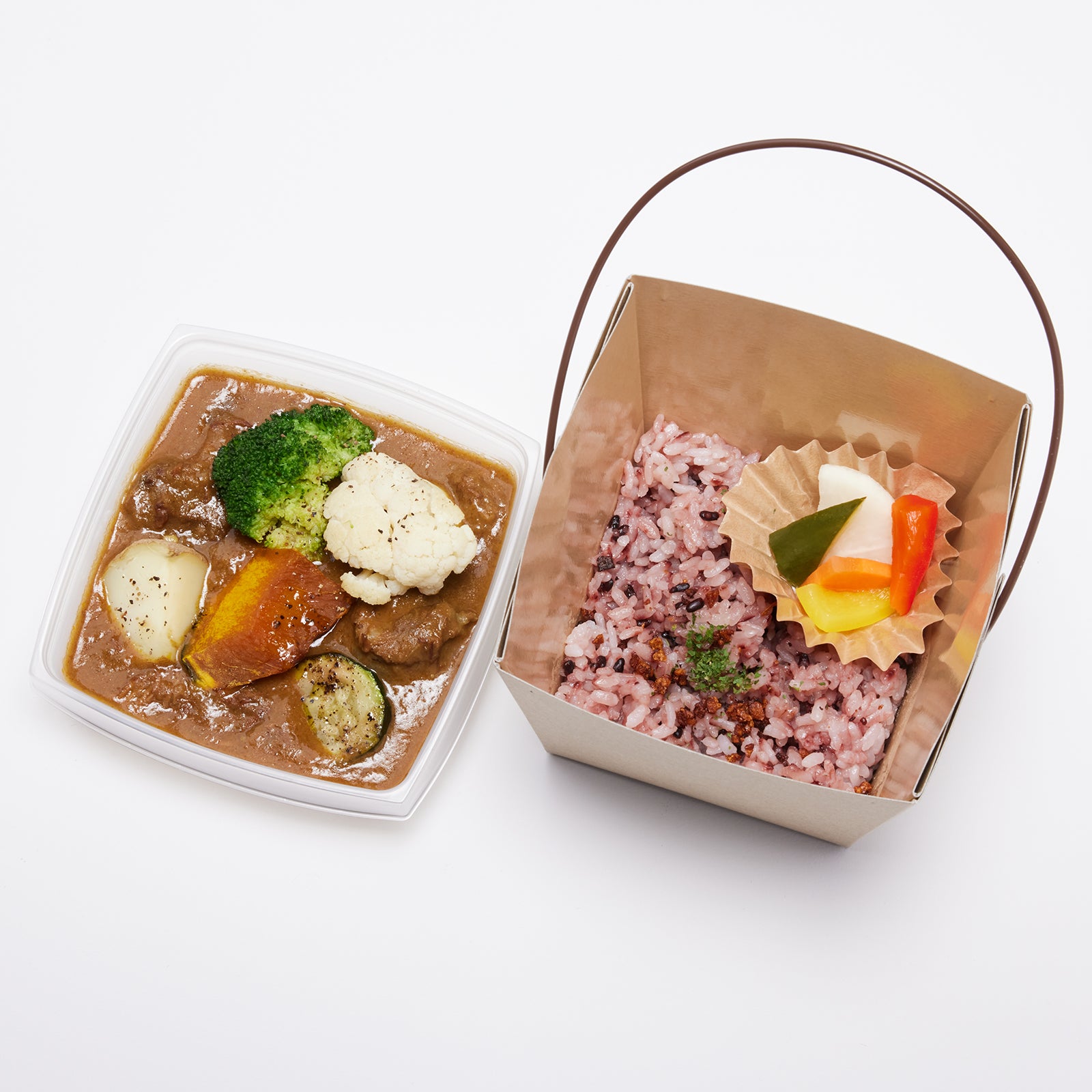ごろっと入った牛すね肉が、コクのある欧風カリーとの相性バツグン。スパイスとフライドガーリックが効いた中辛のカレーが食欲をそそるお弁当。自家製ピクルス付き。