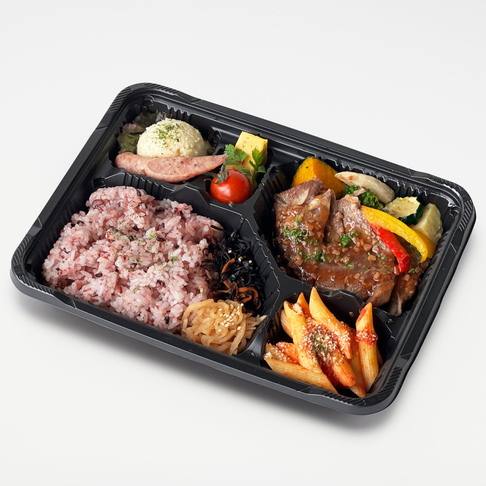 上質な赤身肉のリブロースステーキ「ビステッカ・マリモンティーナ」が入った特製弁当。日によって変わる副菜も豊富で、食べ応えのあるお弁当です。