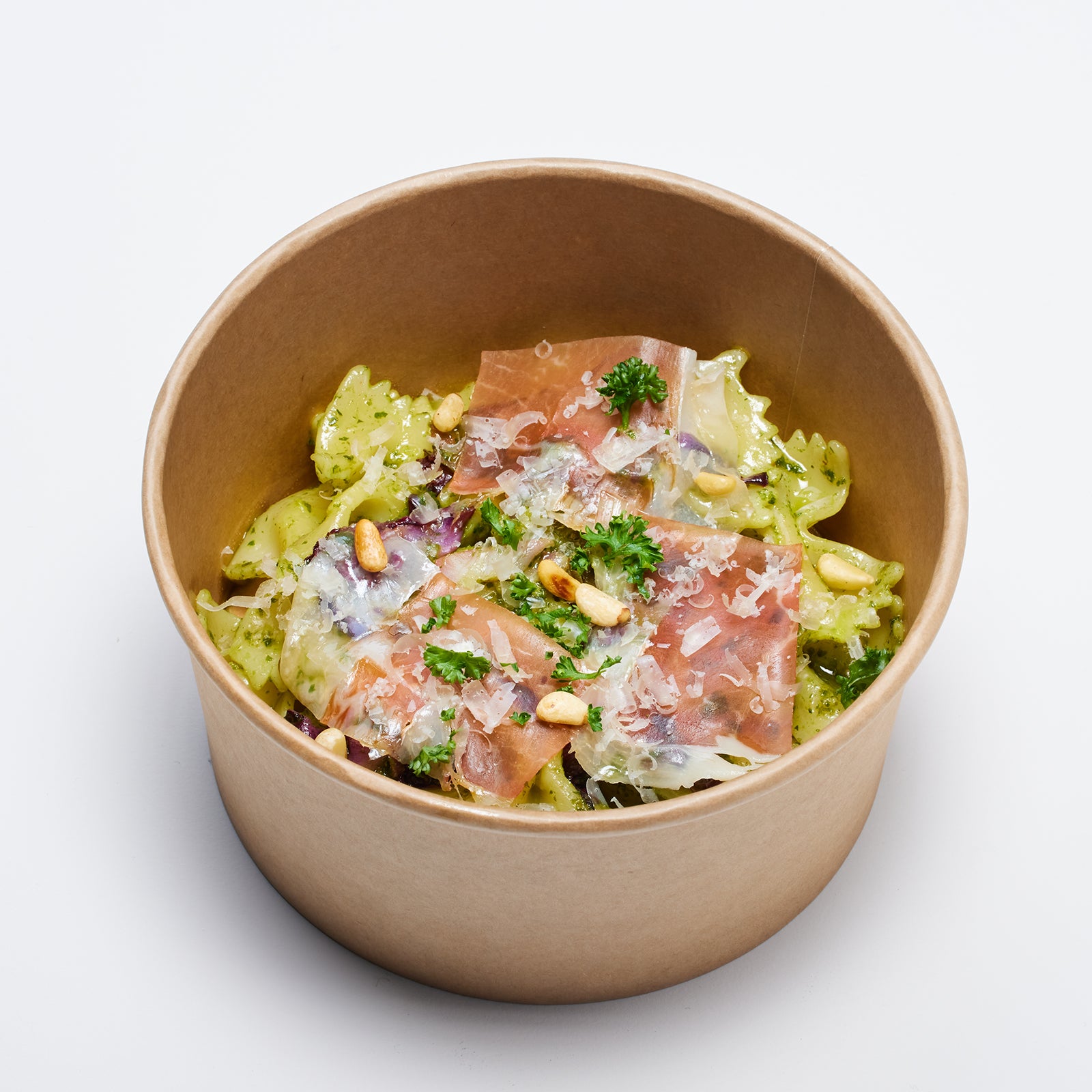 バジルと大葉を練り込んだオリジナルジェノベーゼソースに生ハムの甘みとトレビスの苦味がマッチした大人のパスタ。ファルファッレは蝶の形のパスタ。